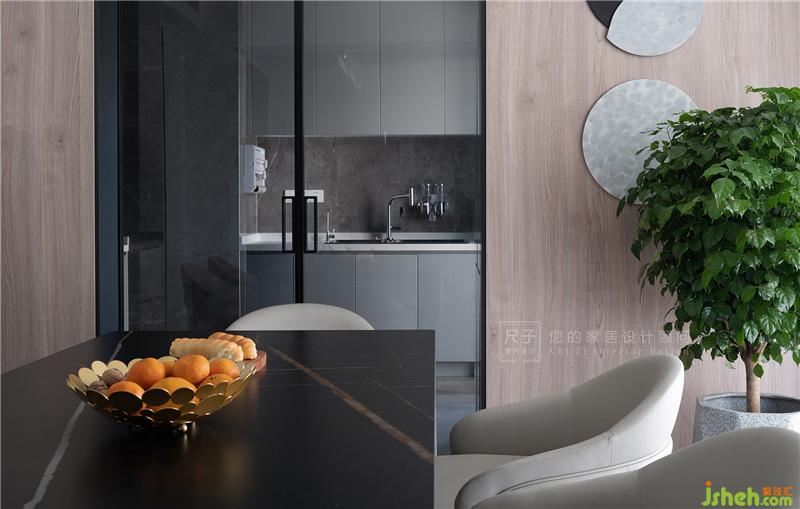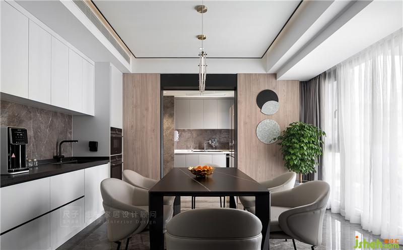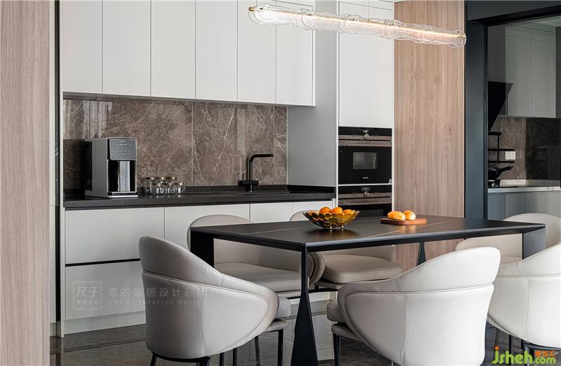 美食產(chǎn)生的地方要有美好的環(huán)境。我們利用餐邊柜作為西廚拓展烹飪空間,嵌入烤箱、冰箱等家電,以令人愉悅的美學方式整合空間,讓Z小姐能盡情在這里解鎖新的廚藝技能。理智克制的黑白灰中融入了自然的木色,讓用餐的氛圍更加溫馨。