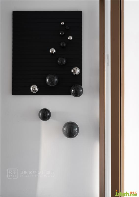 過道裝飾畫的選擇更為抽象,金屬球四散而落或升騰而起,空間中自由與優(yōu)雅的細膩情感在這里被不斷放大。