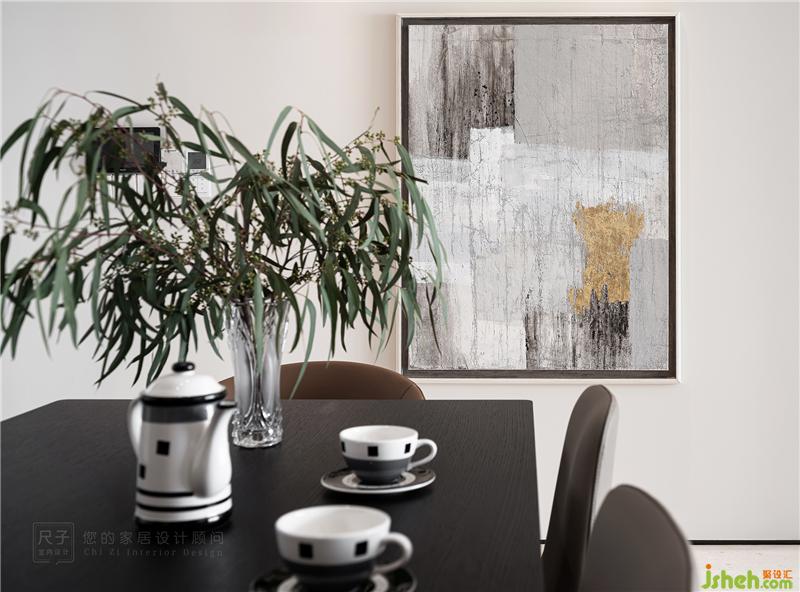 為延續(xù)空間的整體性,餐廳墻面采用了與客廳一致的材質(zhì)造型;褪去復(fù)雜的裝飾元素,高低錯落護(hù)墻板與時尚輕靈的藝術(shù)涂料,從肌理效果上呈現(xiàn)了更多細(xì)節(jié)。