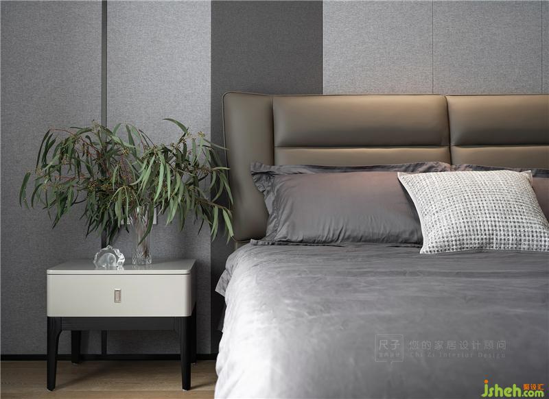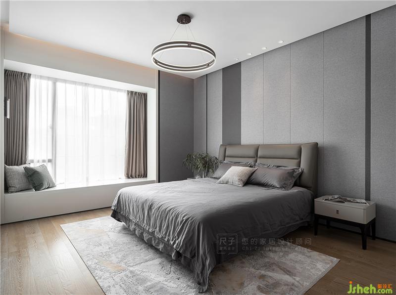 主臥充分考慮到夫妻二人的喜好,優(yōu)雅而克制?;疑舶由熘溜h窗,形成圍合式布局,提升空間質(zhì)感。