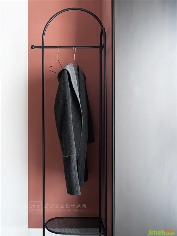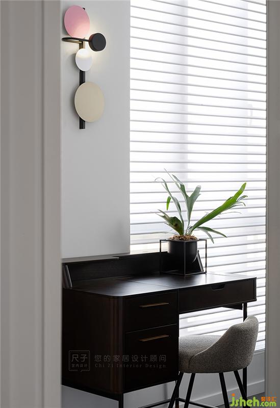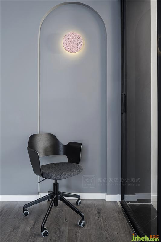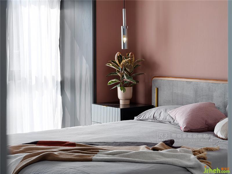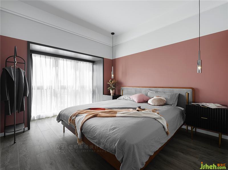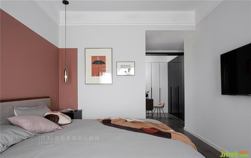 臥室以煙粉作為主色調(diào),煙粉色從床頭向兩側(cè)延伸,形成半圍合的狀態(tài),給居住者足夠的心里安全感;黑白色的穿插又讓大面積的粉色不會過分甜膩。