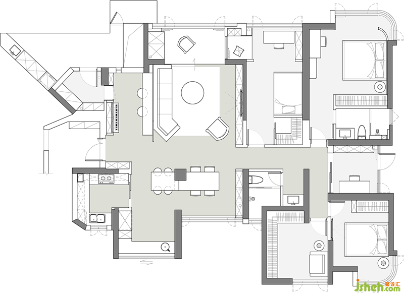②陽臺利用:設計師將客廳、餐廳的陽臺納入室內(nèi),增加全屋使用面積,也讓室外的陽光更易進入屋內(nèi),提高空間采光