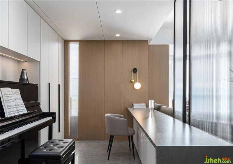 ①空間融合:公共空間的設計遵循著開放式、一體化的原則,設計師將書房、客餐廳全部打通,維系空間的完整性