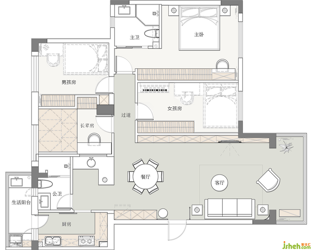 設(shè)計師綜合屋主一家的居住需求,對戶型進(jìn)行了優(yōu)化處理: