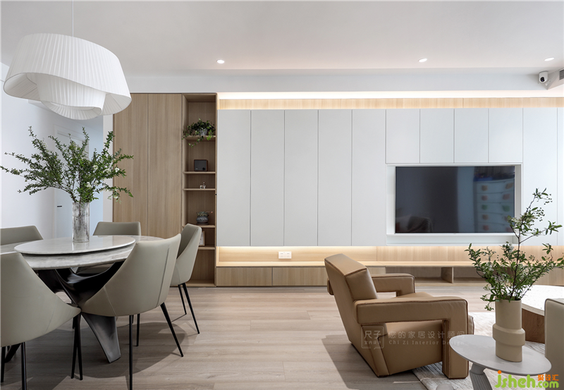 客餐廚一體化的布局,奠定了空間通透明亮基礎(chǔ),一整排橫跨客餐廳的儲物柜,可見這個家的收納能力。