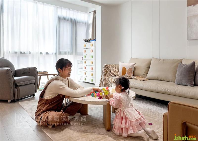 在這個三代同堂的家中,空間與空間的互通性、交流性是設(shè)計師考慮的第一要義。尺子室內(nèi)設(shè)計選擇將陽臺擴(kuò)進(jìn)客廳,開辟出一塊屬于孩子們的活動區(qū),一塊親子交流的小天地。在任何一個平凡的午后,與家人在客廳沏上一壺茶小敘生活,或是同孩子在這里搭建“城堡”、嬉戲歡騰,便是最真實的幸福。