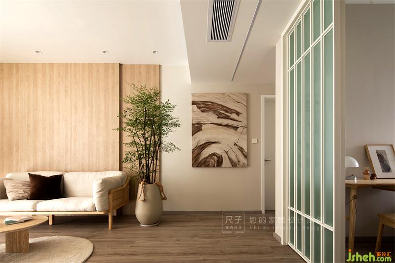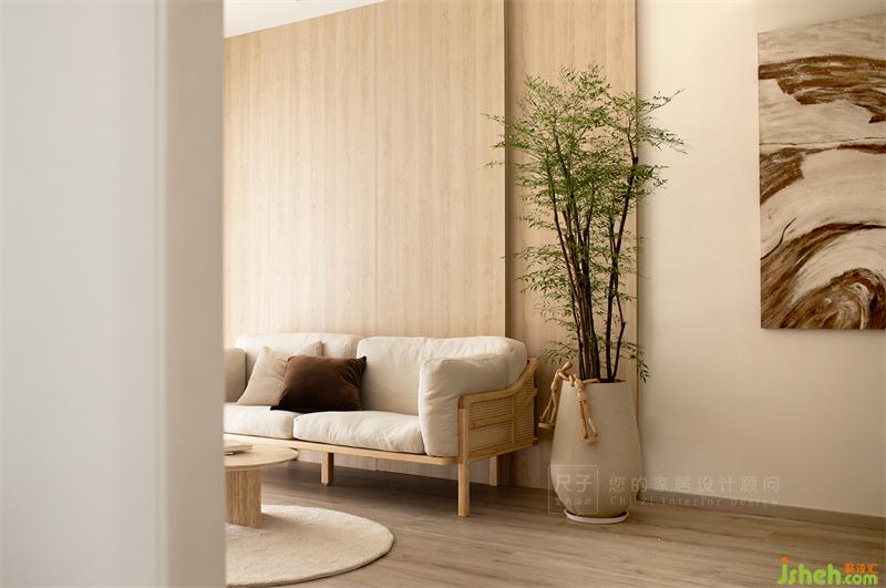 客廳色調(diào)清淺而純粹,原木色的運用給整個空間帶來溫潤的觸感。