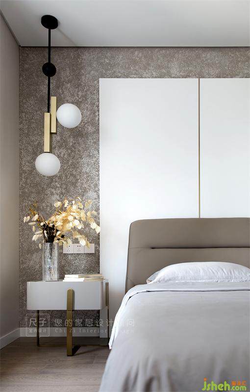 白色烤漆板組成的半圍合式床頭布局給人一種心理安全感,藝術(shù)涂料的色彩與紋理與之形成鮮明對(duì)比,不同材質(zhì)的交匯融合營造出低調(diào)優(yōu)雅的居室氛圍。