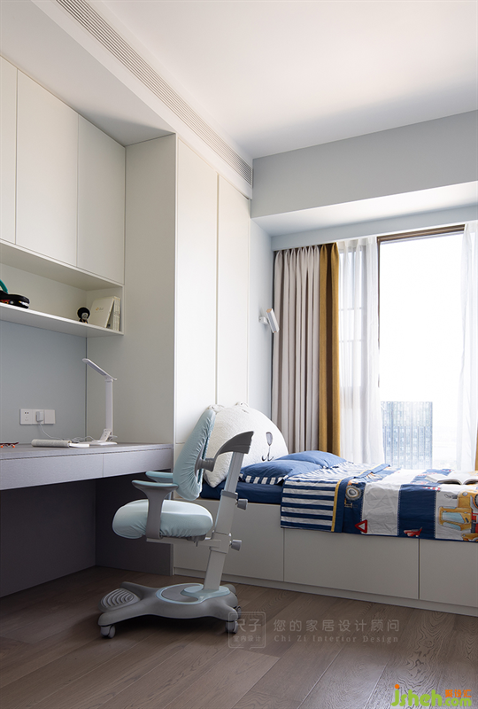 男孩房簡單大方,功能齊全,卡通玩具的布置,賦予空間生動(dòng)活潑的特質(zhì)。
