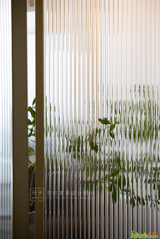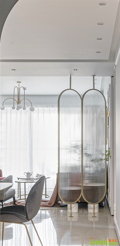 視線穿過圓潤的拱形門洞,金色的邊框與兩扇長虹玻璃組成屏風(fēng)隔斷,影影綽綽中透出一絲客廳的模樣。