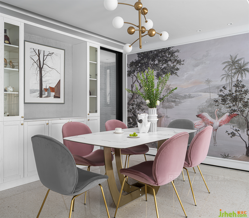 淺淡的筆墨自帶朦朧美感,勾繪出山川叢林,以及在河流中自由舒展身姿的火烈鳥;邁入餐廳,就仿若置身于浪漫的大自然。