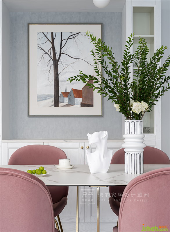 精美的線條勾勒出這個家的基底,低調(diào)的灰白中加入輕柔的粉與藍(lán),將復(fù)古優(yōu)雅且輕松愜意的氛圍渲染得淋漓盡致。