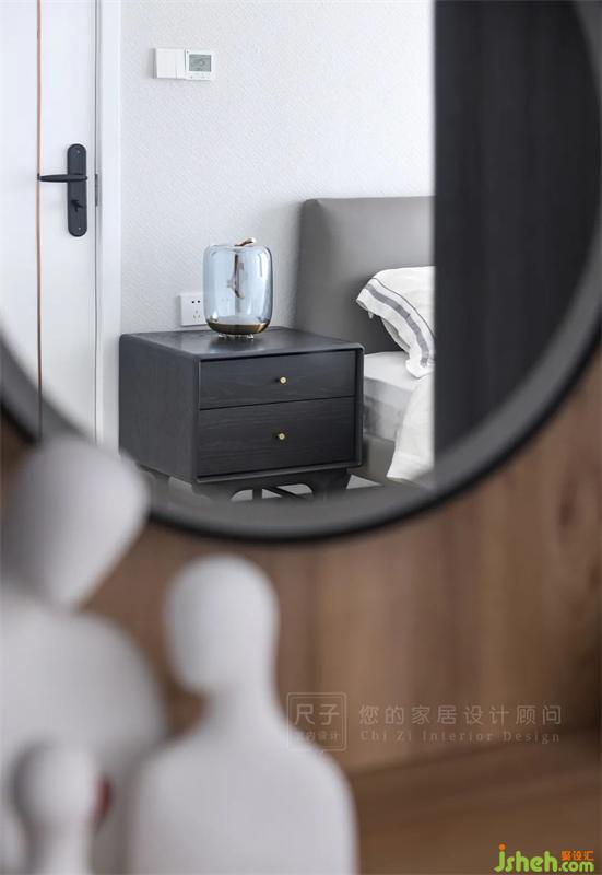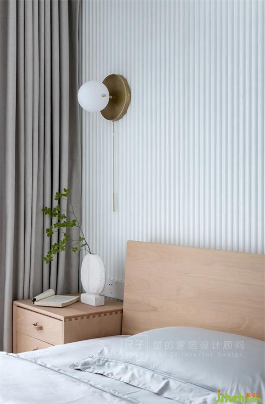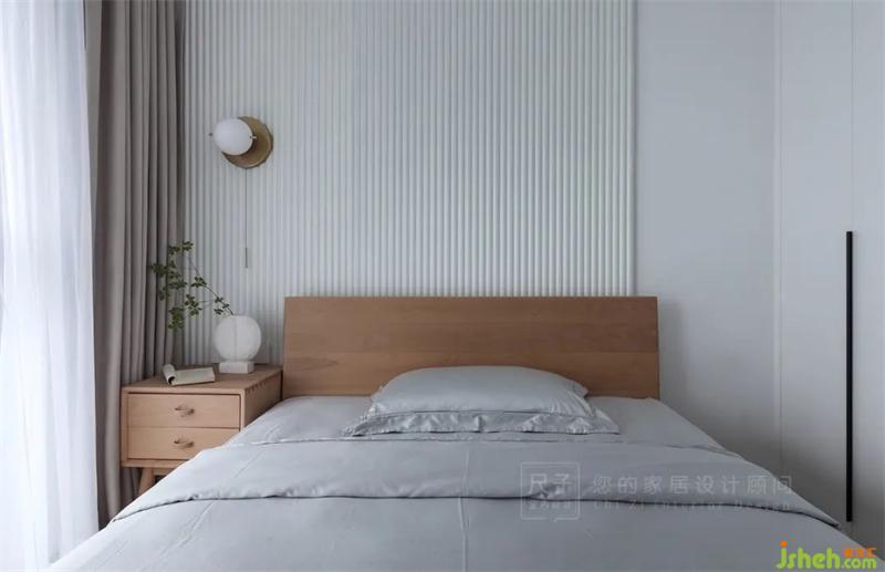 長輩房隱藏在與墻面同色的房門背后,暖白與木色的搭配給人溫暖宜居的感覺。床頭波浪板自帶浮雕般的立體感,無形中化解空間的單調(diào),使居住空間變得靈動起來。