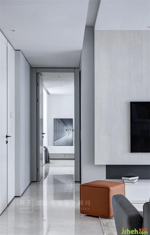 過道一側(cè)的房門由原本的深木色改為與墻面一致的暖白色,顯得更加高級大氣。