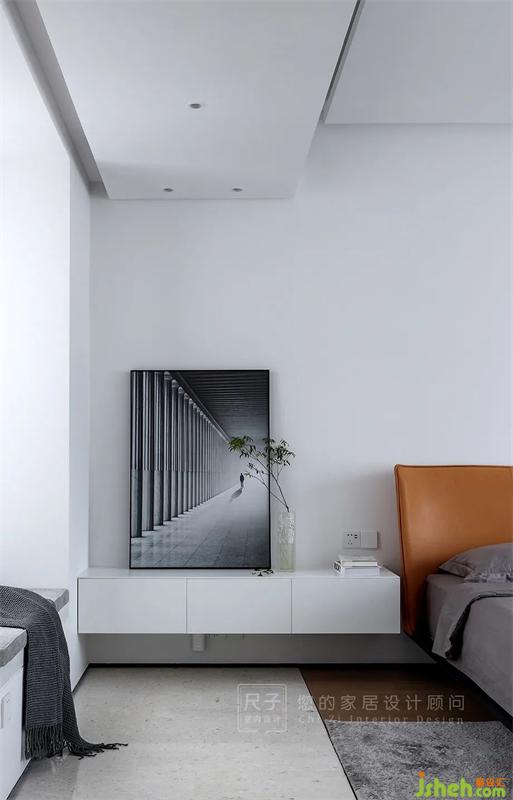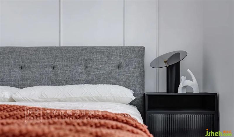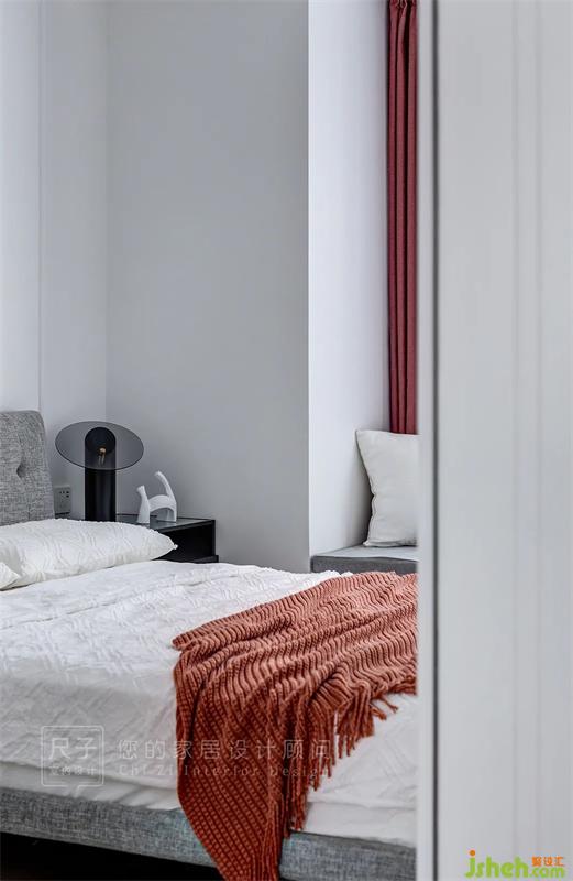 次臥空間的布置更多元更靈活,床是淡雅的灰色,添置上白色床品,磚紅色的搭毯與窗簾在簡約的空間中顯現(xiàn)出獨有的活力。