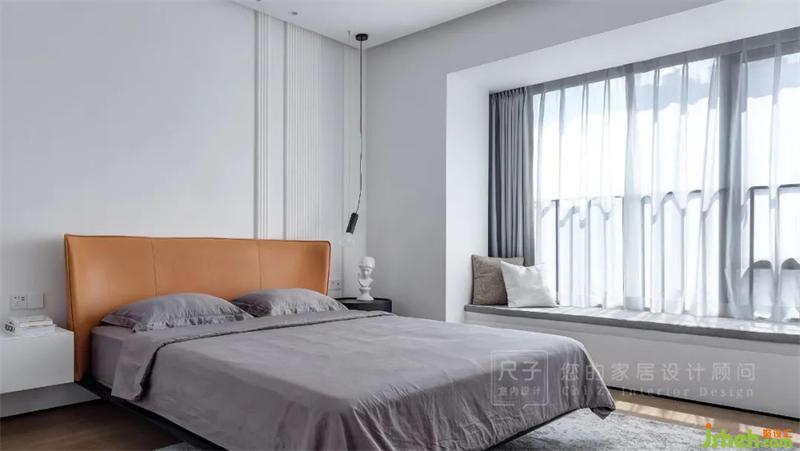 主臥延續(xù)著簡約的風(fēng)格,灰白為主的空間低調(diào)而溫和,橙色床頭背靠與墻面波浪板點綴,中和淺色系空間的輕盈;精裝房改造柔軟的灰色棉質(zhì)床品與窗簾呼應(yīng),打造自然愜意的睡眠空間。