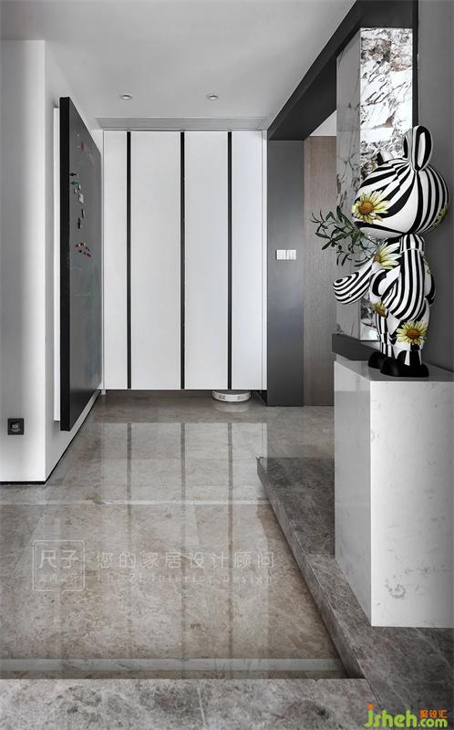 我們將原玄關(guān)與客廳相連的墻體、隔斷書(shū)房與玄關(guān)的柜子,深色的大理石及復(fù)雜多層的天花全都拆除。