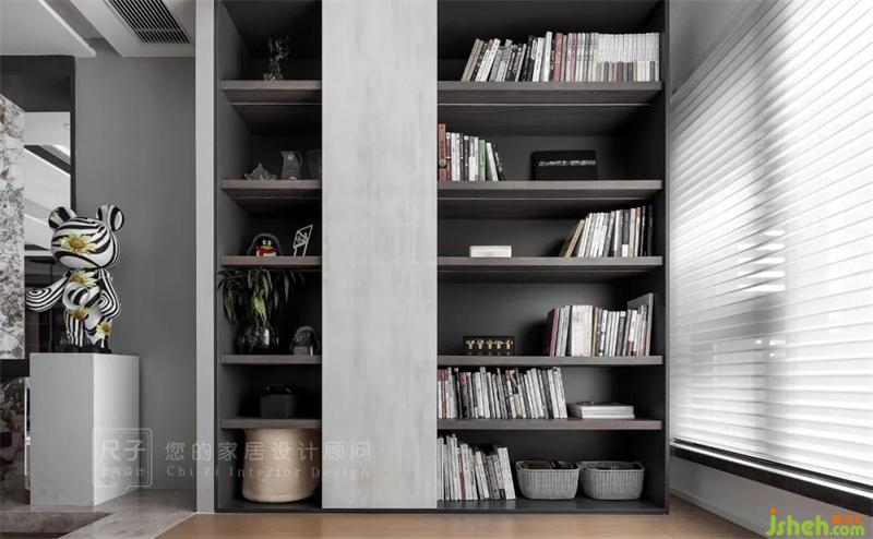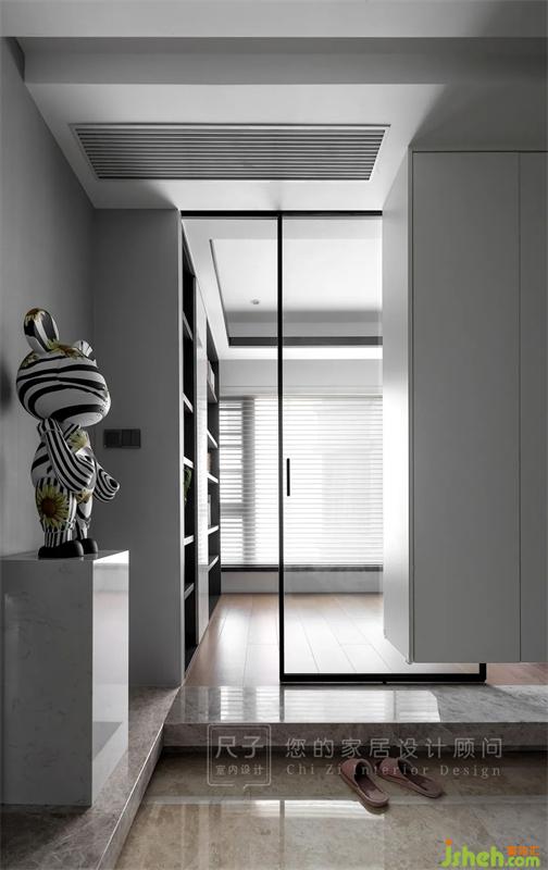 利用地臺(tái)、懸掛吊柜的方式,將書(shū)房形成一個(gè)相對(duì)獨(dú)立的空間,同時(shí)又保證了玄關(guān)擁有足夠一家四口日常放置鞋子的地方。