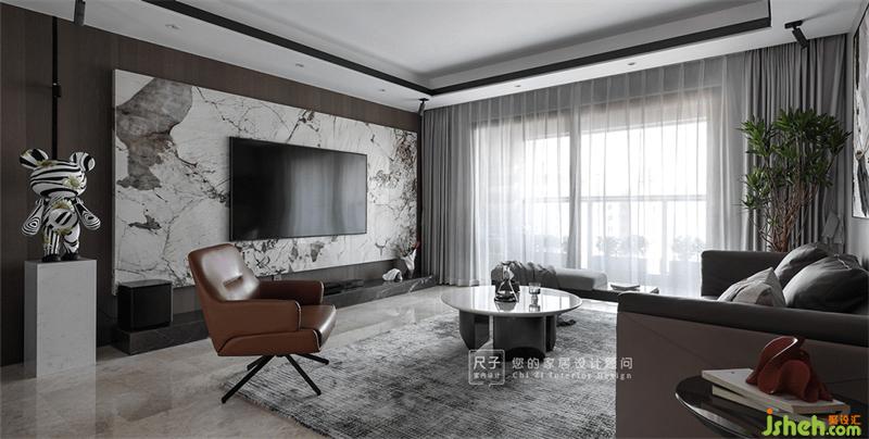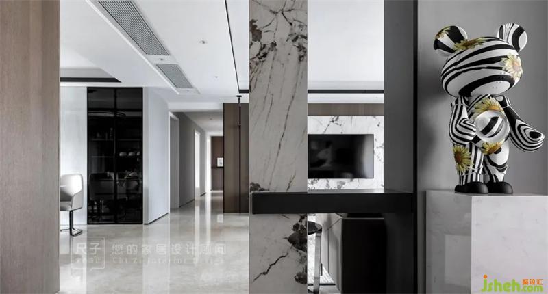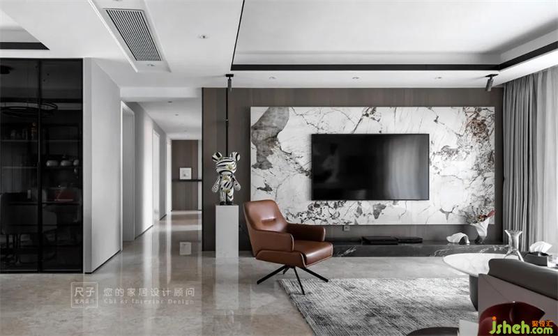 電視墻的巖板,是玄關(guān)柱子材質(zhì)的延伸,與素凈的木飾面形成對(duì)比,不過(guò)于花哨,卻不失亮點(diǎn)。