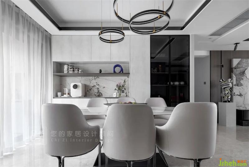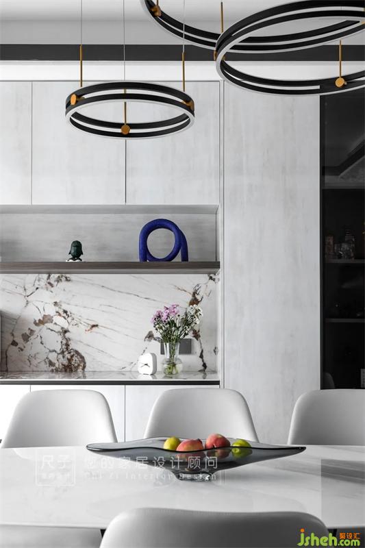 主人原想在餐廳擺放圓桌,但又想有一個(gè)餐邊柜可日常操作咖啡機(jī)等小電器,幾番權(quán)衡下,最終采用了長(zhǎng)餐桌與餐邊柜結(jié)合,餐邊柜分成展示區(qū)與操作區(qū),主人愛茶,家中大大小小的茶罐也有了合適的地方擺放。