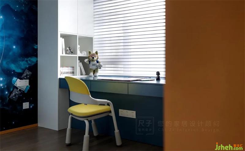 裝修設(shè)計(jì)利用原來的長(zhǎng)飄窗,做了一個(gè)超大書桌,滿足兩兄弟一起學(xué)習(xí),一起看書的需求。