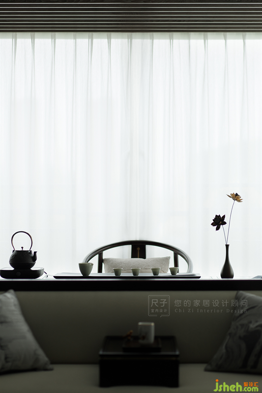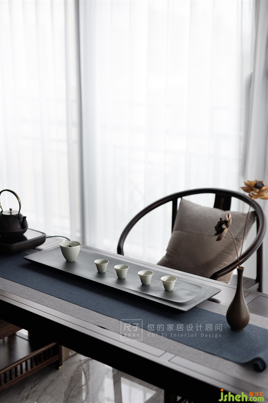 休閑陽(yáng)臺(tái)的一部分并入客廳空間作為品茶區(qū),背后是一整面的落地窗,開闊的視野,天然的采光,這個(gè)區(qū)域作為品茶區(qū)無(wú)疑是很好的選擇。