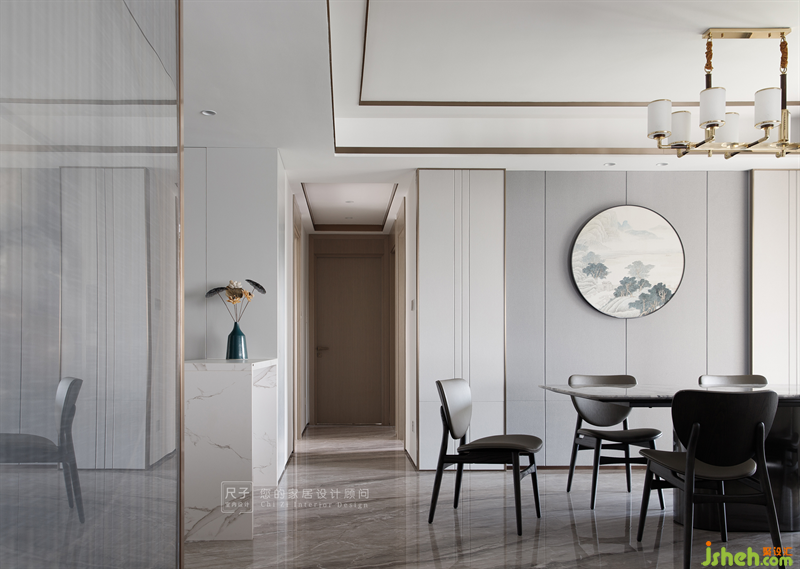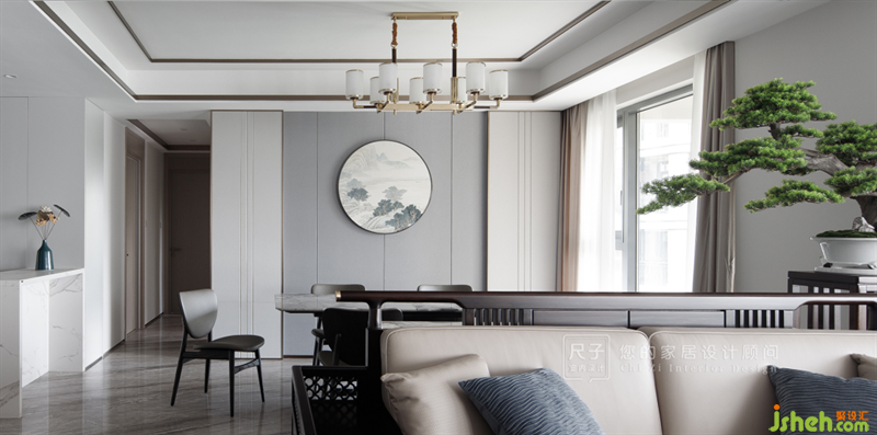 “朦朧淡月云來(lái)去”,進(jìn)門后映入眼簾的是極具韻味的格柵屏風(fēng),屏風(fēng)連接客餐廳與玄關(guān),輕柔而半透明的色調(diào)若隱若現(xiàn),若即若離,為客餐廳蒙上一層神秘的面紗。