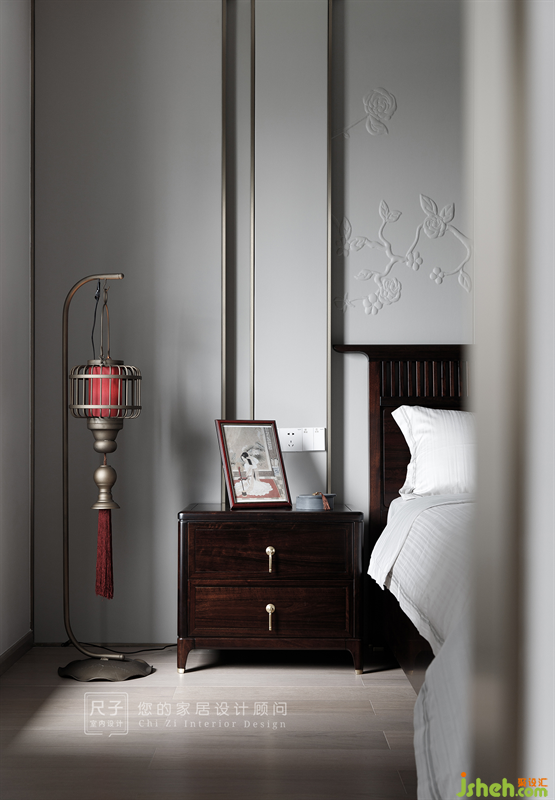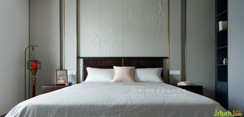 主臥延續(xù)了整體的風(fēng)格,疊級設(shè)計在床頭背景和天花上都有體現(xiàn),床頭精巧的硬包造型營造出寧靜雅致的氛圍,將整個空間渲染得越發(fā)舒適淡雅。