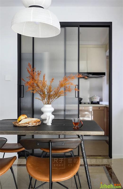 原廚房門拆除改為長(zhǎng)虹玻璃推拉門,餐廚區(qū)呈現(xiàn)出來(lái)的狀態(tài)是開(kāi)放多元,且通透無(wú)阻礙的??臻g除了既定的功能屬性外,更是與家人交流的場(chǎng)所。