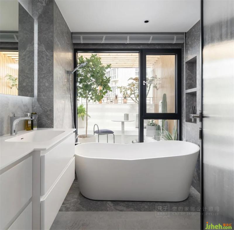 頂樓復(fù)式設(shè)計(jì)主衛(wèi)向陽(yáng)臺(tái)方向進(jìn)行了擴(kuò)充,臨窗砌置了一個(gè)大浴缸,通透的玻璃將陽(yáng)臺(tái)的風(fēng)格帶入洗浴空間,盡顯品質(zhì)生活。