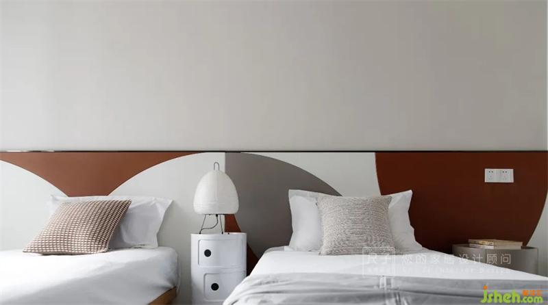 對(duì)于充滿私人屬性的臥室,盡可能貼合居住者的個(gè)性。于是有了以不規(guī)則的幾何色塊裝飾的床頭背景,讓小孩房顯得更加靈動(dòng)活潑。