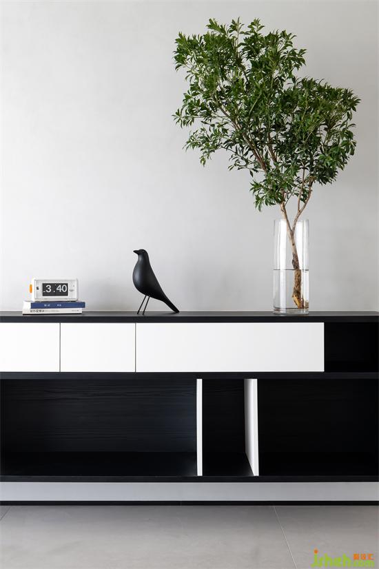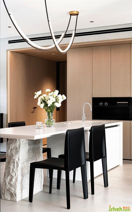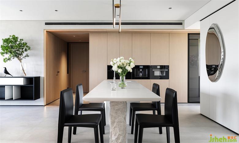 餐桌與吧臺(tái)一體,純白色的巖板桌面下是天然的石頭支撐,足夠長(zhǎng)的臺(tái)面,深圳家裝設(shè)計(jì)豐富了原本單一的功能屬性,整排儲(chǔ)物柜則滿(mǎn)足了公共區(qū)的收納需求。