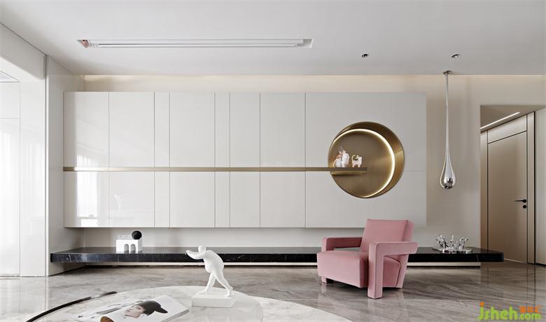 客廳儲物柜兼顧儲物和造型感,橫線條猶如人生的翹翹板,是這個家支撐了兩個小女孩的成長。深圳家裝設(shè)計白夜童話小女孩擺件、水滴的裝置、單人位沙發(fā)一粉一藍的搭配,餐廳的雙環(huán)鏡子、都圍繞其中。