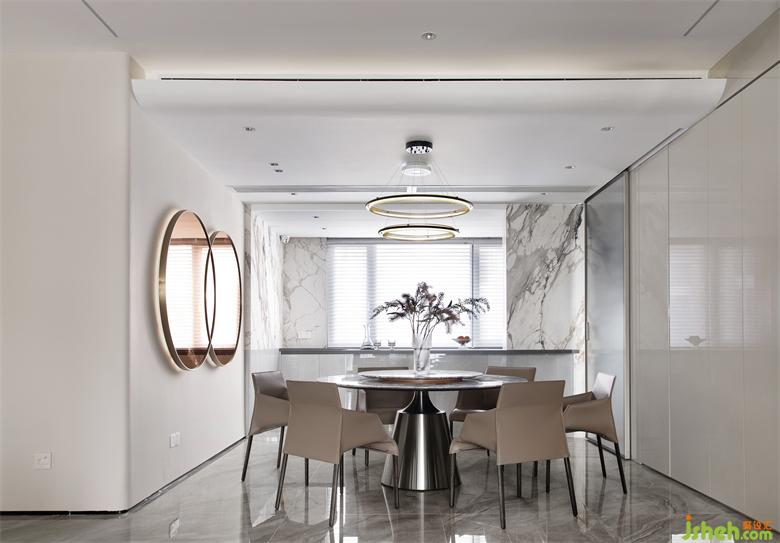 弧形線條遵循一定韻律延伸至餐廳,圓形元素在家具配飾上的運用,深圳家裝設(shè)計讓整體氛圍清冽的餐廳多了絲絲柔和的感覺。