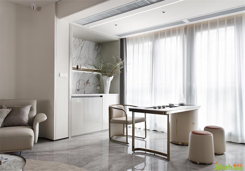 公共空間以淺奶咖色為主體色調(diào),遵循業(yè)主大家庭理念,將客廳、餐廳、茶區(qū)、西廚區(qū)相連的視覺特點,帶來闊達的空間尺度,加上大面積的落地玻璃,更顯大氣。