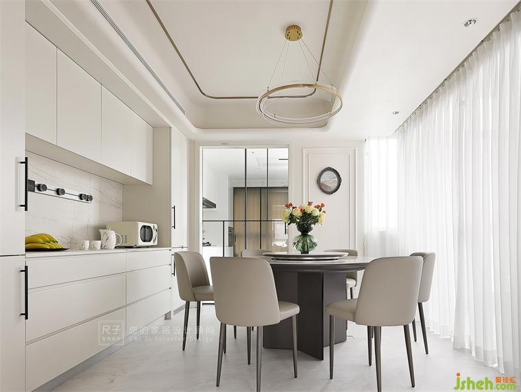 餐廳軟硬平衡又能彰顯簡(jiǎn)潔的華麗,掛畫與線條增添一絲低調(diào)時(shí)尚的輕法式格調(diào),白色餐邊柜與紗簾透過的光線,深圳裝修設(shè)計(jì)讓空間呈現(xiàn)干凈明亮的質(zhì)感,與家人在這里探尋藝術(shù)與生活深層的感知。