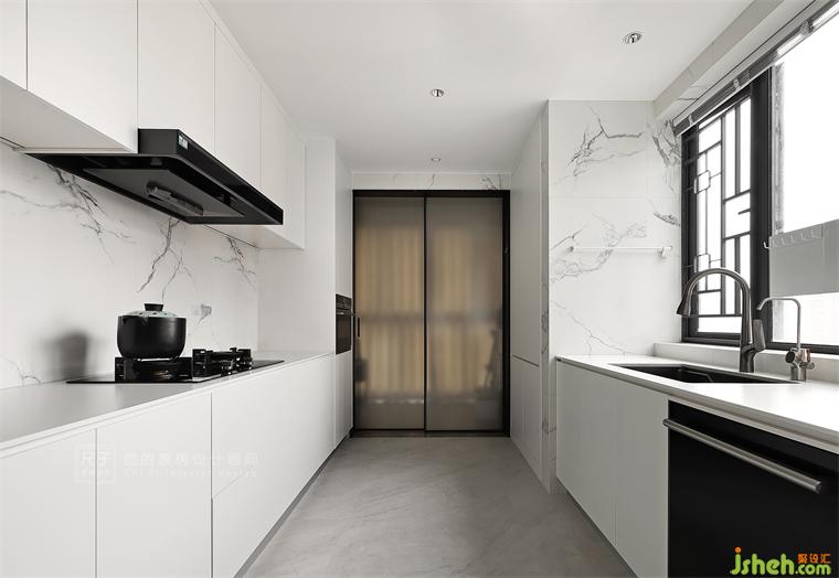 透明玻璃推拉門連接廚房,自由穿梭的動(dòng)線賦予更多的可能性;開闊的空間白色+巖板,配合自然光線演繹寧?kù)o而優(yōu)雅的環(huán)境。