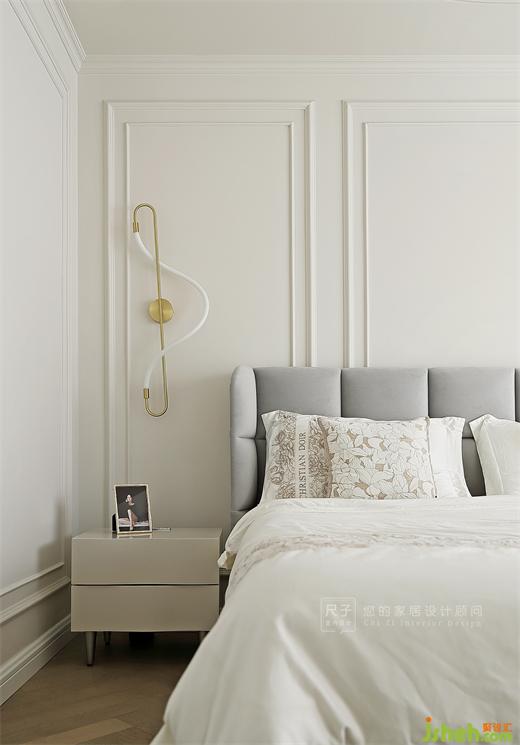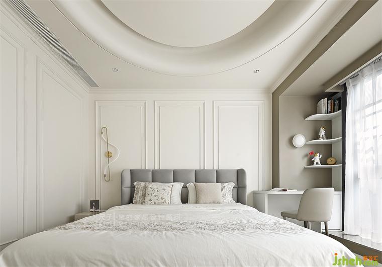 主臥以雅致為主調(diào),吊頂造型形成視覺張力,法式線條帶來(lái)精致優(yōu)雅氛圍的同時(shí),深圳裝修設(shè)計(jì)拉伸了空間的高度;局部的金屬材質(zhì)運(yùn)用也增加品質(zhì)感。