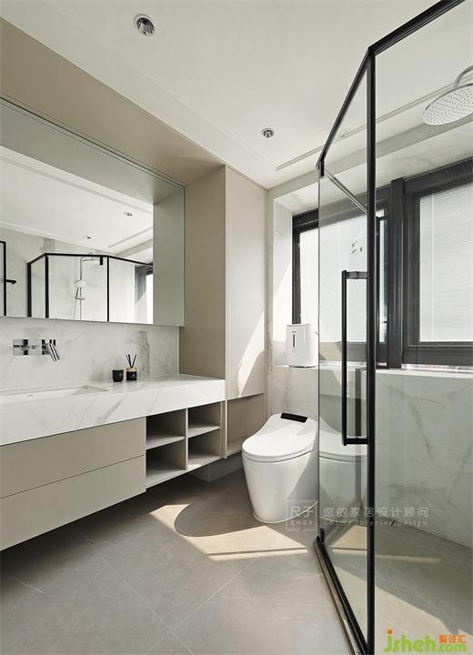 主衛(wèi)鏡子帶來(lái)空間的開闊感,墻面巖板飾面,深圳裝修設(shè)計(jì)極簡(jiǎn)的色彩搭配,干凈又有高級(jí)感。
