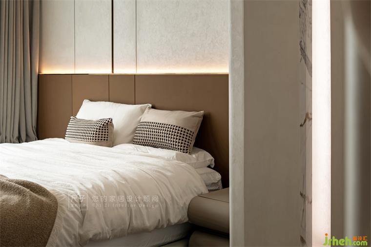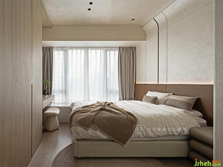 主臥半隔斷巧妙成為兩處區(qū)域的間隔點,騰出更多的活動空間,又保證隱私的尺度;裝修設計吊頂弧形的設計通過藝術(shù)涂料的自然紋理,打造空間的流動質(zhì)感。