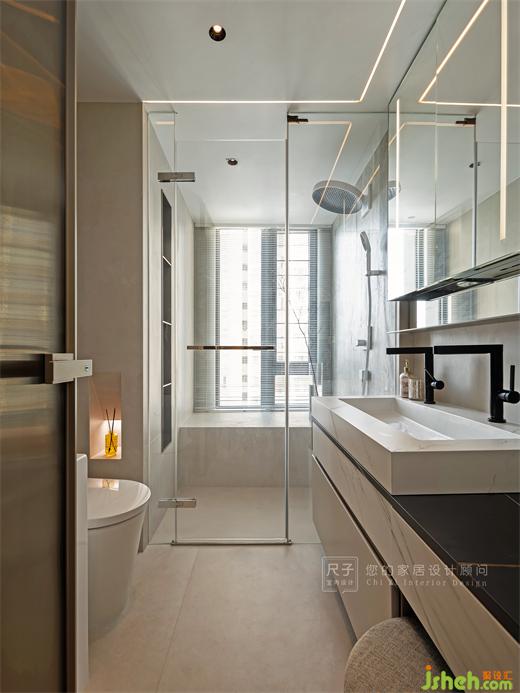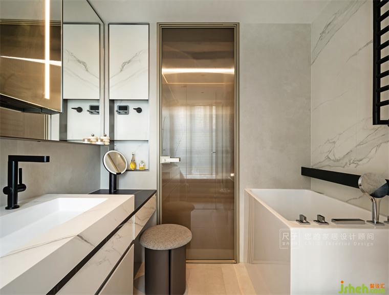 主衛(wèi)整體開闊通透,線性燈帶暖光與巖板一冷一暖的碰撞,高級又美觀,裝修設計陽光在淋浴房墻面暈染成更加細膩迂回的光影。