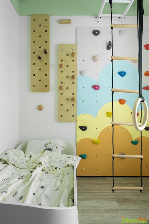 各個空間有各個空間的設計風格,男孩房不僅有睡眠學習區(qū),還有攀巖、攀爬架的設計,滿足小男孩好動活潑的性格;女孩房充滿儀式感又有寬敞的活動空間。