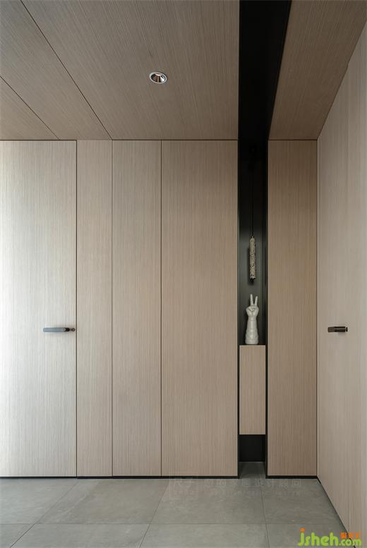 玄關(guān)是重要的過渡空間,深色的瓷磚結(jié)合木質(zhì)天花,我們用一個(gè)“木盒子”將玄關(guān)區(qū)域清晰界定出來,讓人真切感受到從戶外回到了自己的私人領(lǐng)地。