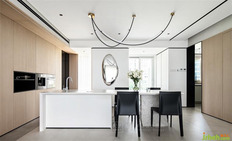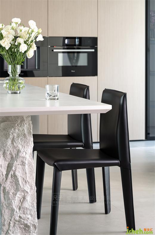 餐桌與吧臺一體,純白色的巖板桌面下是天然的石頭支撐,足夠長的臺面,家裝設(shè)計(jì)豐富了原本單一的功能屬性,整排儲物柜則滿足了公共區(qū)的收納需求。