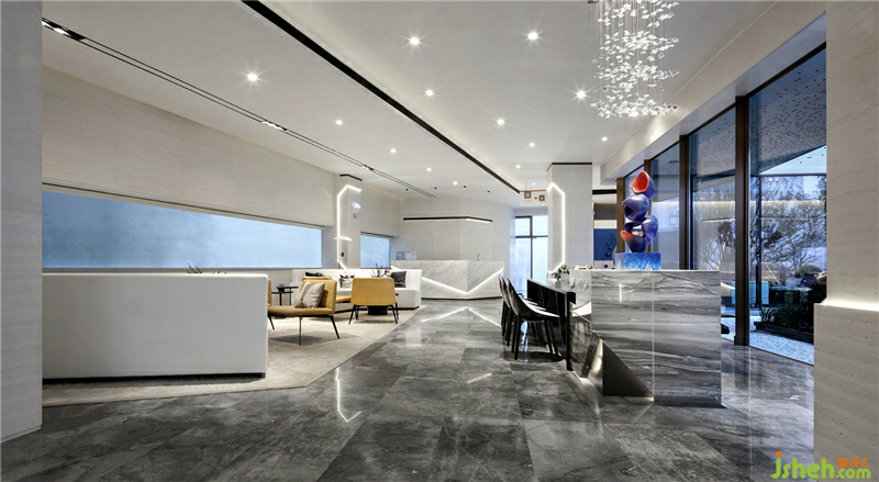 空間中的光線,透過(guò)景觀幕墻與天花、墻面相輝映,最終在大型裝置的吊燈中流轉(zhuǎn),轉(zhuǎn)而出現(xiàn)的是一種超越線性的延伸,可并存、恒久,成為光對(duì)空間的極限表意,而形成瞬間的焦點(diǎn)。