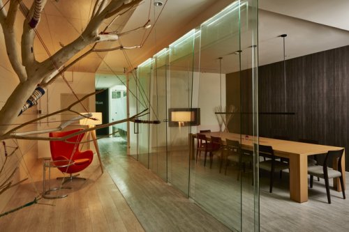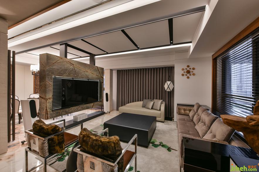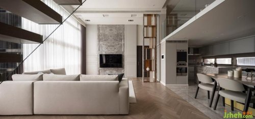 兩面開窗的客廳與同享採光面的餐廳之間,利用一道反應力結構的電視牆區(qū)隔客廳與餐廳空間,兩側(cè)上下皆留下視線與光影可自由流動的路徑,電視牆六個面都包飾紋理粗獷卻富雅趣的仿古石頭,增加多面向的觀賞價值,並以紮實的預鑄鋼構工法,強化上懸吊的安全穩(wěn)定,上方因應鐵件結構抬升的天花板黑色燈溝線條一路延伸至餐廳區(qū),掌握沈穩(wěn)中軸線,也賦予視覺仰角的律動節(jié)奏。