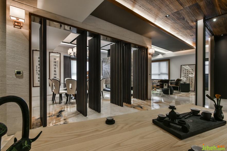 一進門的玄關適度的開放尺度,跳脫刻意分割或制式高櫃的思考,在平面規(guī)劃階段,就善用佛堂隔間催生隱藏式衣帽間,並將大門到餐廳格柵間的開放區(qū)域規(guī)劃為品茶區(qū),讓第一眼的目光即能享受深邃且轉(zhuǎn)折分明的環(huán)景之美。室內(nèi)設計師