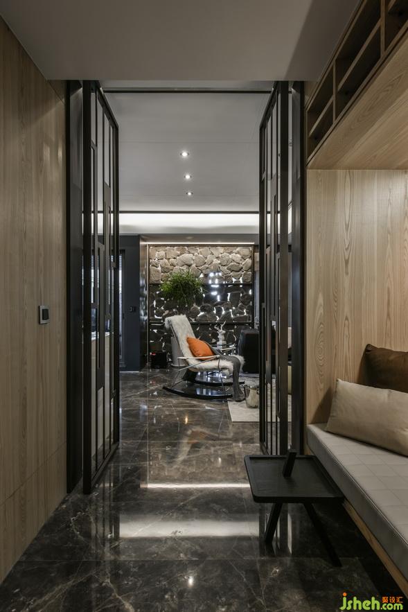 空間演譯:利用巖盤的不規(guī)則性拼貼成蜂巢結(jié)構(gòu),以六角模矩為單位,組構(gòu)成氣孔牆,讓外牆的光線再一次透過巖盤空隙,灑落到居室空間,煙燻木紋的染色性,如同大雪覆蓋後的植披,隱約的表露極地的冰冷感.室內(nèi)設(shè)計師