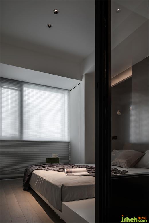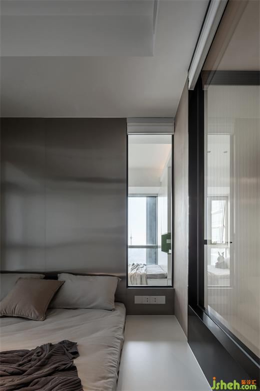 臥室顏色以白、灰為主臥室背景墻面采用拉絲不銹鋼的反光材質(zhì),既是一種裝飾,也能呼應(yīng)金屬的現(xiàn)代摩登,與現(xiàn)代簡(jiǎn)約風(fēng)格形成強(qiáng)烈視覺反差。同時(shí)我們將主臥室與兒童房之間做了一扇窗,既可以增加主臥的采光,又可以讓父母第一時(shí)間關(guān)注到孩子的成長(zhǎng)與安全。隨著孩子慢慢長(zhǎng)大并對(duì)隱私性有要求的時(shí)候,我們也貼心的將這扇窗增加了蜂窩百葉功能,隨時(shí)隨地根據(jù)居者需求調(diào)整光線及隱私。
