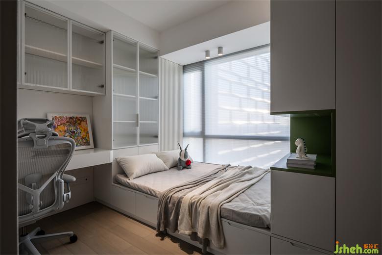 次臥——集休息與學習于一體,獨屬于孩子的安靜空間。天津和平翰林公館裝修設計搭配柔和色調的床品等軟裝布置,營造出舒適安逸的氛圍。超大獨立儲物柜,方便收納,不顯凌亂~